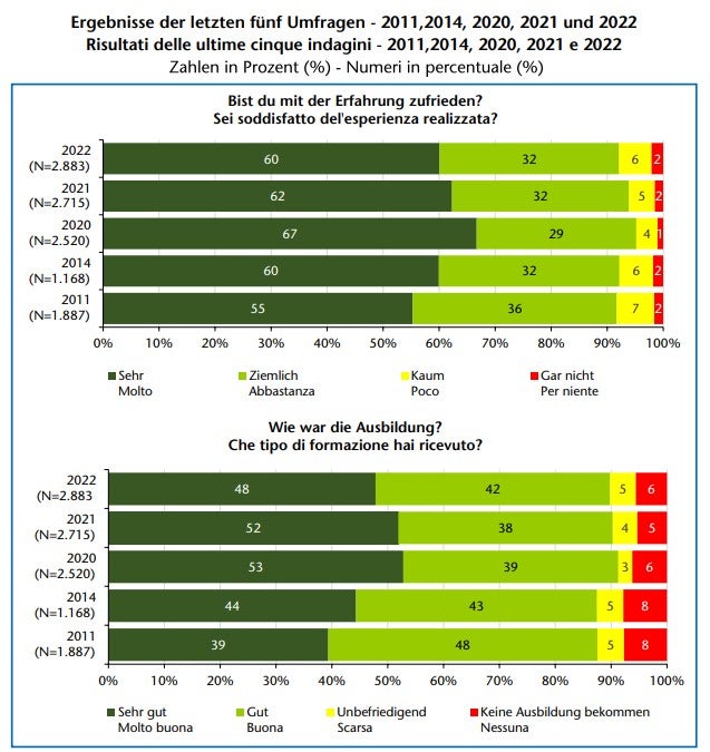 Sei intervistati su dieci sono molto soddisfatti della loro esperienza di tirocinio, tre su dieci sono abbastanza soddisfatti; la percentuale di tirocinanti "delusi" si aggira intorno al 10%. Nel complesso, 9 tirocinanti su 10 rifarebbero un'esperienza del genere. Il carattere formativo del tirocinio è abbastanza sviluppato: tre quarti dei tirocinanti sono stati formati regolarmente in azienda e addirittura 9 su 10 confermano di aver imparato qualcosa di nuovo. Per quanto riguarda la soddisfazione per la retribuzione, la metà si dichiara soddisfatta e un altro 30% è abbastanza soddisfatto. Nel complesso, questi dati dimostrano che il tirocinio è uno strumento di politica del lavoro di successo. Con quali aspettative i giovani affrontano un tirocinio? Quasi cinque su dieci vogliono "lavorare e guadagnare qualcosa", quattro su dieci vogliono "conoscere il mondo del lavoro" e uno su dieci vuole "imparare qualcosa di nuovo nella professione che più mi interessa". L'ordine di queste risposte non è cambiato negli ultimi anni.