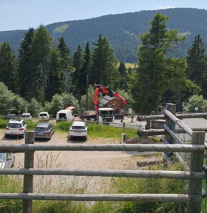 - L'installazione del pilone di trasmissione nel parcheggio dell'Alpe di Villandro (Foto: RAS) » [IMG 227 kB]